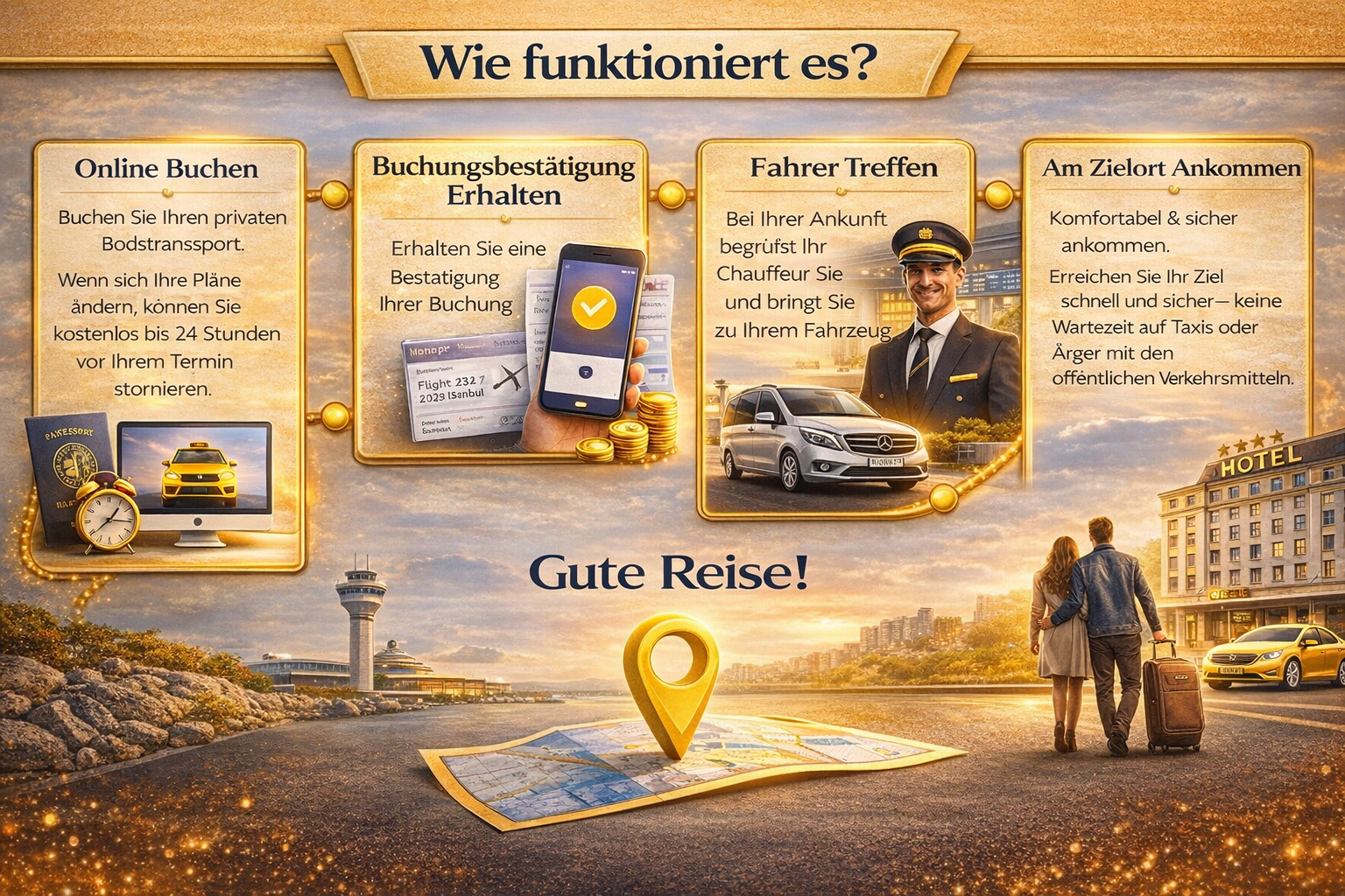 Die Buchung Ihres privaten Flughafentransfers in Istanbul ist ganz einfach. Wir bemühen uns, Ihnen den bestmöglichen Service zu bieten. Sie müssen einfach das Formular auf unserer Website mit Ihren Reisedaten ausfüllen und sich entspannen. Folgen Sie den Schritten, um Ihren Flughafentransfer in Istanbul im Voraus zu buchen.